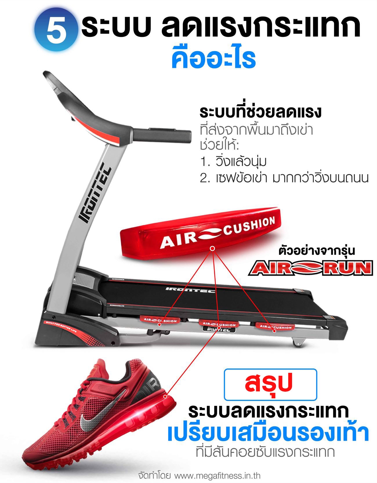 ลู่วิ่งที่ดีจะมีระบบซับแรงกระแทก เพื่อช่วยทำให้การวิ่งนั้นนุ่มสบาย และไม่ทำให้ข้อเข่าเสื่อมสภาพเร็วเมื่อการวิ่งข้างนอก